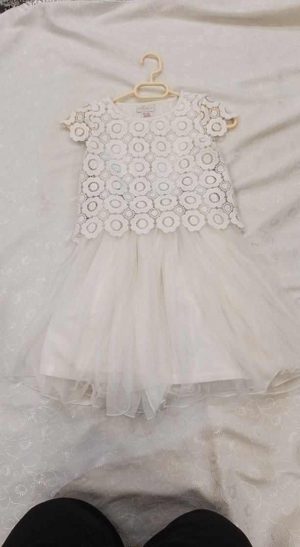Beyaz, nakışlı dantel detaylı, kısa kollu, ince örme kumaştan yapılmış kız çocuk elbisesi, klasik şıklık sunar.