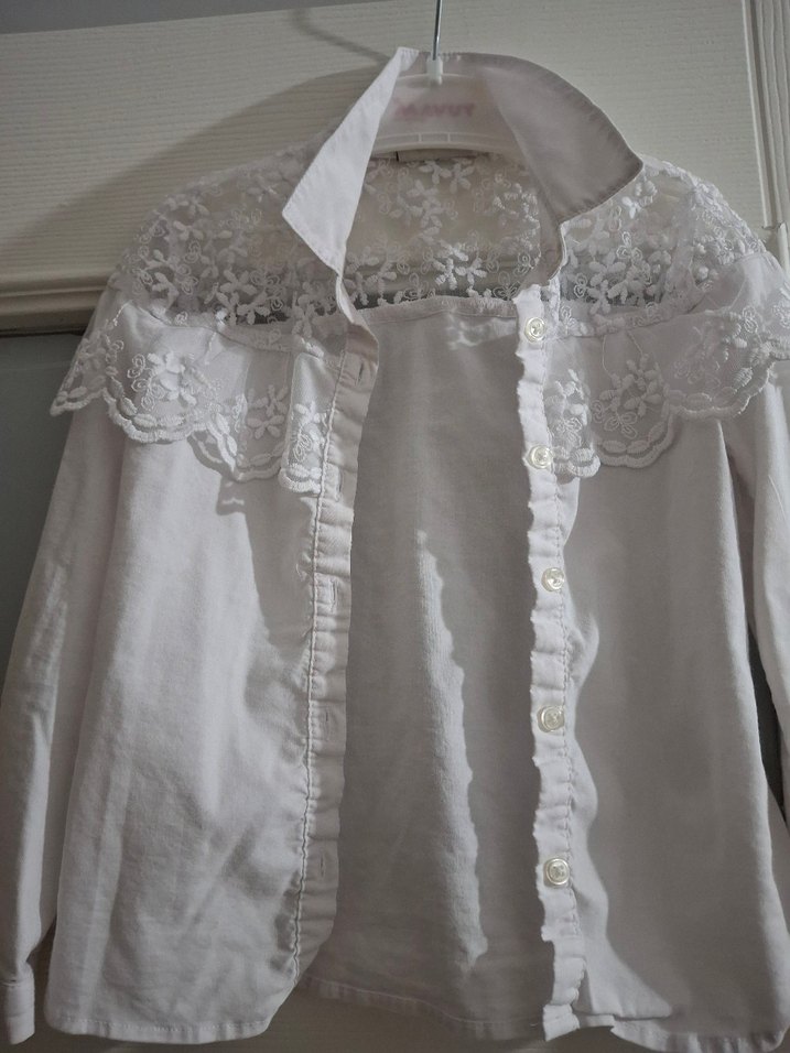 Kız çocuk beyaz keten gömlek, uzun kollu ve yakalıdır. Omuzlarda zarif dantel detayları bulunur. Bol kesimli ve sade, bohem tarzda bir üründür.