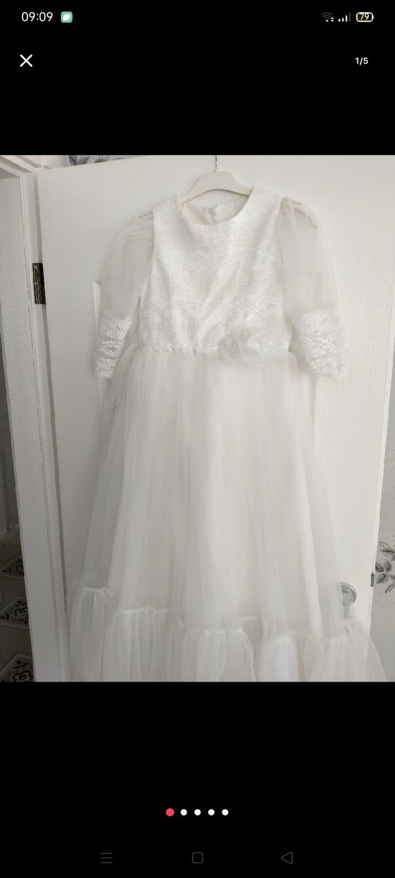 Uzun kollu, yuvarlak yakalı kız çocuk elbisesi dantel detaylarla süslenmiştir. Gevşek kesim ve modern klasik tarzda, hafif beyaz renkte sentetik kumaştan yapılmıştır.