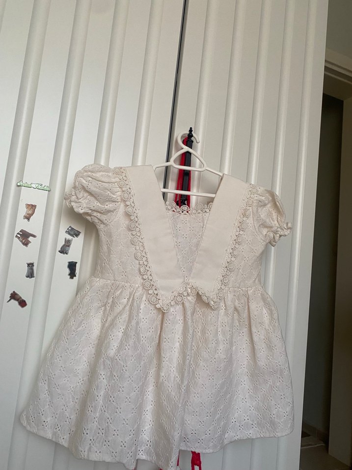 Pamuk kumaştan, dantel detaylı V yakalı, kısa balon kollu, vintage tarzda, fitted kesim kız çocuk elbisesi. 3 yaş