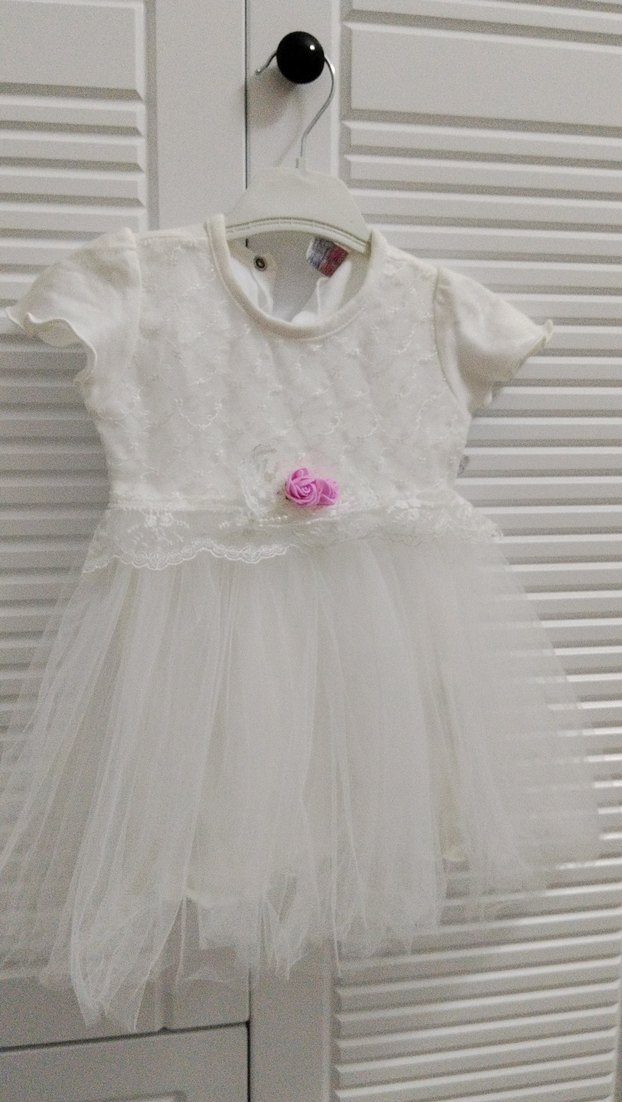 Kısa kollu, teknelik yakalı, işlemeli dantel detaylı beyaz elbise. Modern klasik tarzda, pembe çiçek süslemeli ve yumuşak sentetik kumaştan yapılmıştır.
