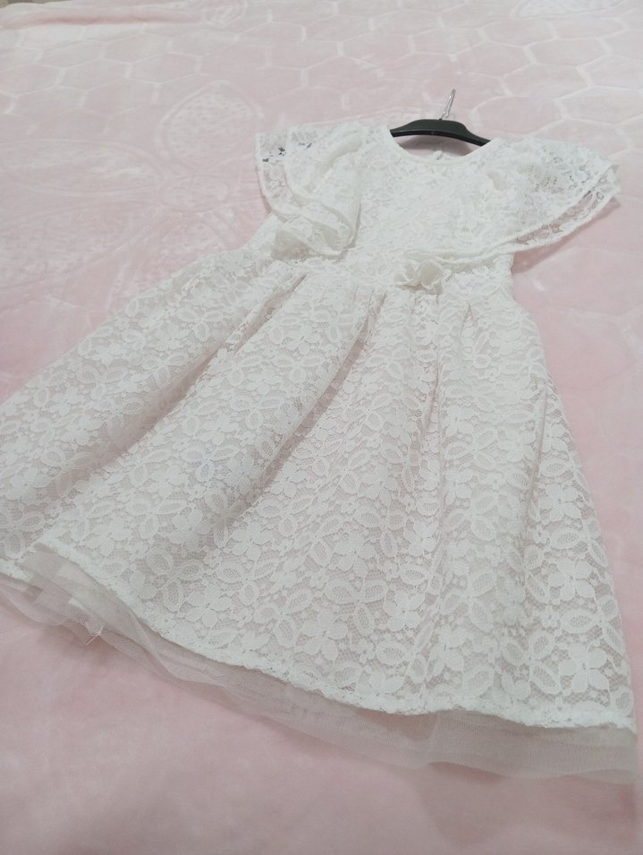 Kız çocukları için beyaz dantel işlemeli, kısa kollu, yuvarlak yakalı, rahat kesim örme kumaştan elbise. Modern klasik tarzda şık bir tasarım.