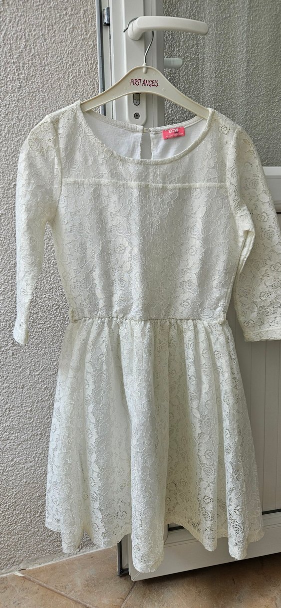 Beyaz pamuklu kız çocuk elbise, dantel detaylı, yuvarlak yakalı ve bol kesim. Uzun kollu, klasik ve bohem tarzda. Dar kesim modeldir astarinda leke vardır kullanıma engel değildir etiket bedeni 11 12 fakat dar olduğu için 9 10 yaşa uygundur