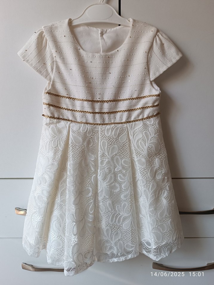 Kısa kollu,beyaz kız çocuk elbisesi, dantel işlemeli Belde altın detaylar bulunur, etiketi yok sadece kullanmadık