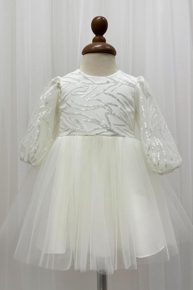 Kız çocuk için uzun kollu, dantel detaylı, işlemeli desenlere sahip, ince beyaz kumaştan, bisiklet yaka ve dar kesim elbise. 5-6 yaş arası uyumu kız çocuk elbise. Göğüs çevresi 60 santim beden uzunluğu 24 santim etek boyu 40 santim. Bedenin arkasında iki ila dört santim arasında pay mevcuttur.