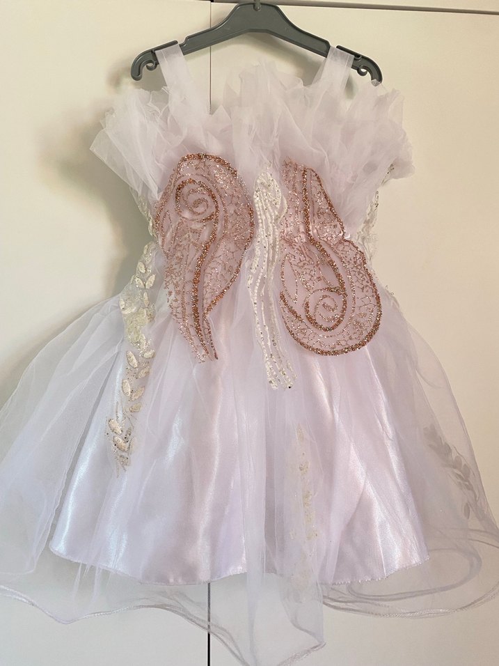 Kız çocukları için beyaz, dantel işlemeli, kolsuz, sentetik kumaştan yapılmış, bohem tarzda, gelinlik .