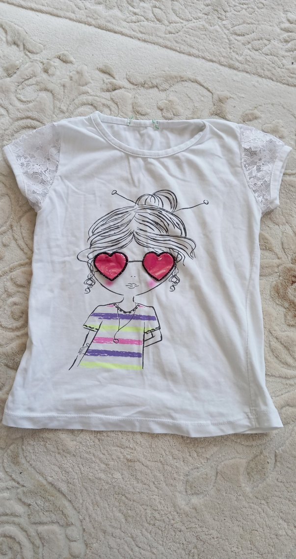 Pamuklu beyaz tişört, kısa dantel kollu ve bol kesimlidir. Önünde pastel renklerde kalp gözlük takan kız baskısı vardır. tane fiyatı