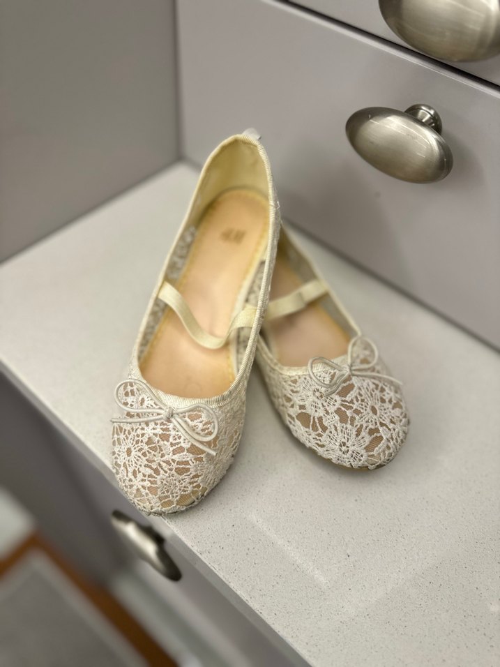 Kız çocukları için beyaz dantel ve nakış detaylı, yumuşak kauçuk tabanlı klasik ve bohem tarzda babetler.
