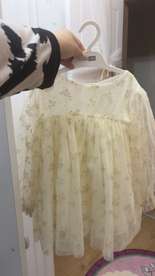 Beyaz bohem tarzda kız çocuk elbisesi, uzun kollu ve bol kesimlidir. İnce nakışlı dantel detayları ve yuvarlak yaka ile klasik bir şıklık sunar. Bir kez doğum gününde giymiştir alındığı gibidir.