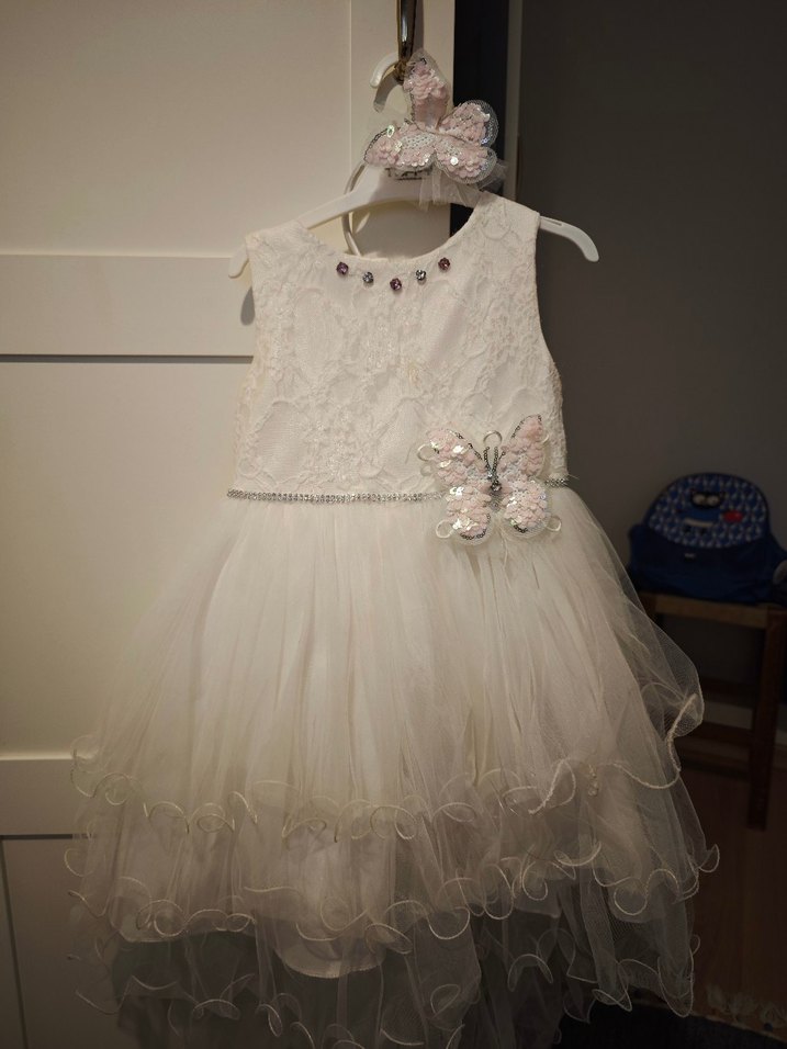 Dantel detaylı, nakışlı kelebek süslemeli beyaz kız çocuk elbisesi. Kolsuz, straplez ve kat kat yumuşak dokulu etek ile bohem tarzda.