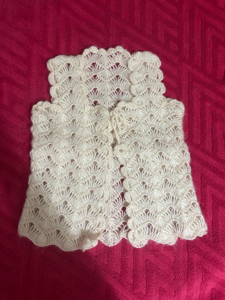 Kız çocukları için beyaz dantel işlemeli, örgü kumaştan yapılmış, kolsuz ve tekne yaka, bohem tarzda dar kesim yelek. İstediğiniz renk ve boyutta sipariş oluşturabilirsiniz
