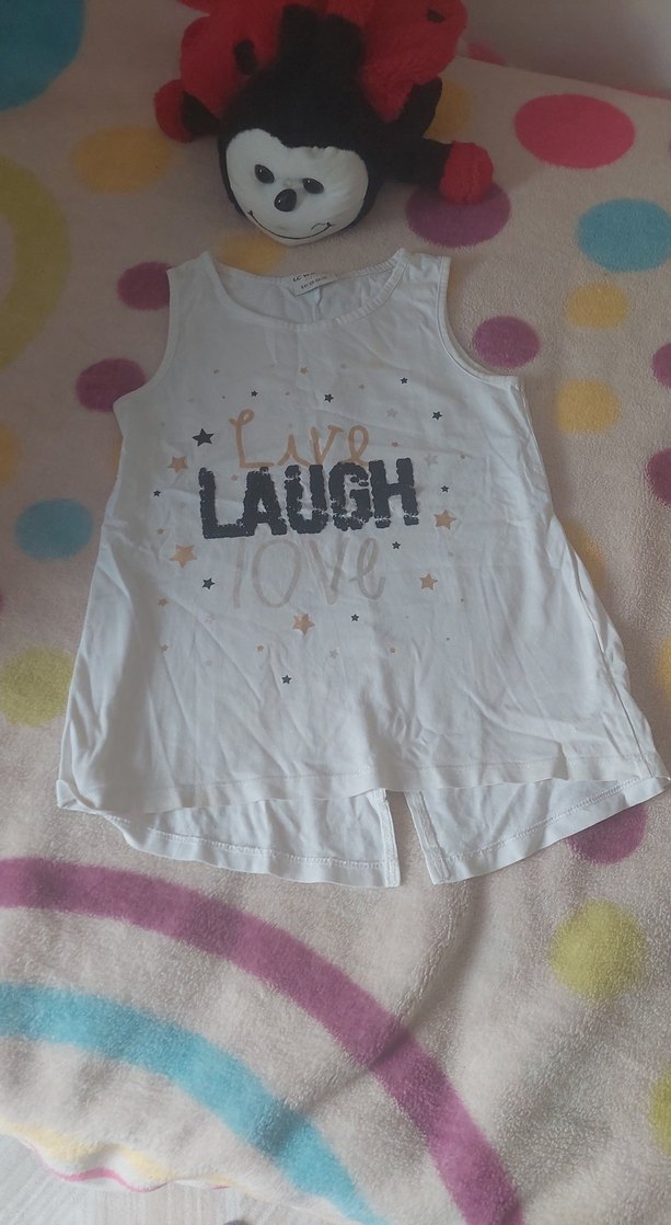 Beyaz pamuklu, kolsuz, bol kesim kız çocuk tişörtü, dantel detaylı ve 'LAUGH' baskılı. Rahat ve şık sokak stili için uygundur.