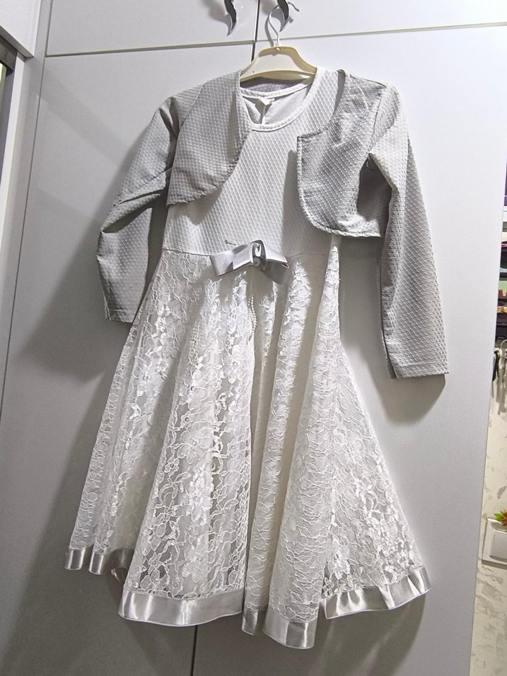 Beyaz dantelli, saten detaylı etek ucu olan klasik kesim elbise ve gri, uzun kollu, yakalı ceket takımı. Sentetik kumaştan üretilmiştir.