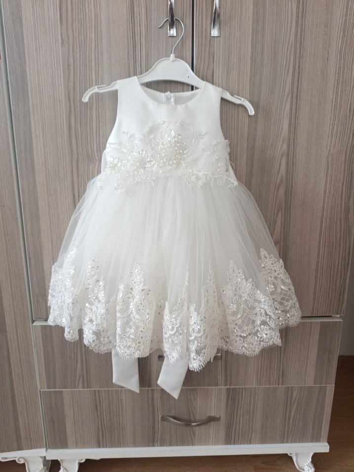 Kız çocukları için beyaz, dantelli nakış detaylı, kolsuz ve straplez yaka tasarımlı, modern klasik görünümlü, yumuşak sentetik kumaştan yapılmış şık elbise.