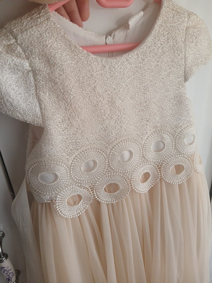 Beyaz triko üst kısmı işlemeli dantel detaylı, salaş kesim kız çocuk elbisesi. Kolsuz, yuvarlak yaka ve akışkan etekli, modern klasik tarzda.Eteginin uç kısmında hafif sökülmesi var dikilebilir.O yuzden fiyatı uygun tutuyorum.Marka temsilidir