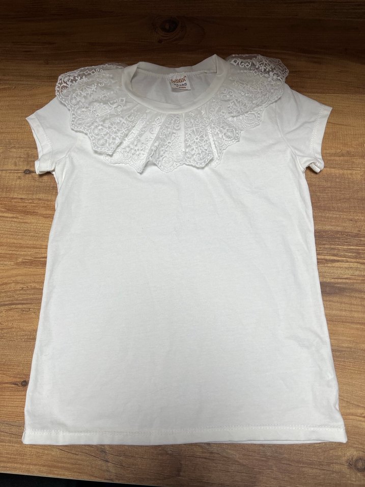 Yumuşak pamuk kumaştan yapılmış, kısa kollu ve yuvarlak yakalı beyaz kız çocuk bluzu. Bohem tarzda, dantelli yakasıyla şık ve rahat bir kesime sahiptir.