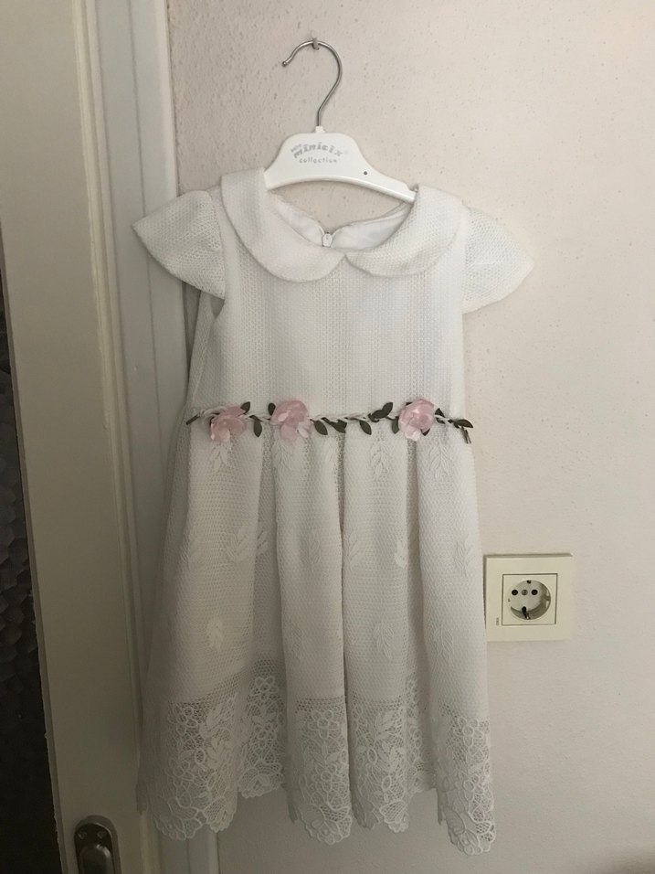 Kısa kollu, yakalı kız çocuk elbisesi, yumuşak triko kumaştan, nakışlı ve dantel detaylıdır. Belinde pastel renkli çiçek süslemeleri bulunur. Rahat kesimlidir.