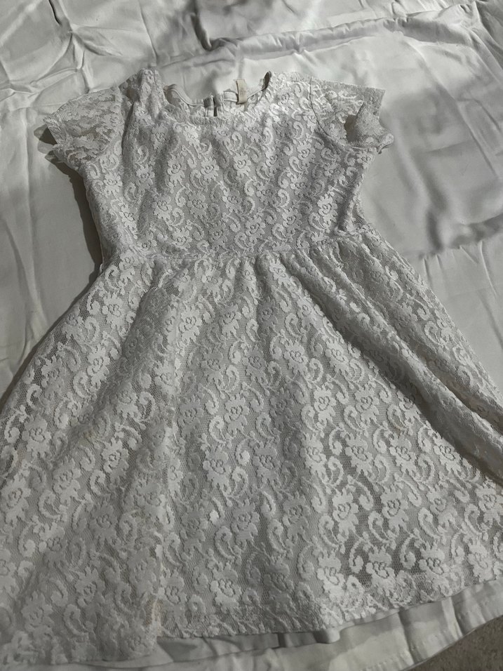 Kız çocuk için beyaz dantelli, nakışlı bohem desenli, kısa kollu ve yuvarlak yakalı ince kesim elbise. 5/6 yaş