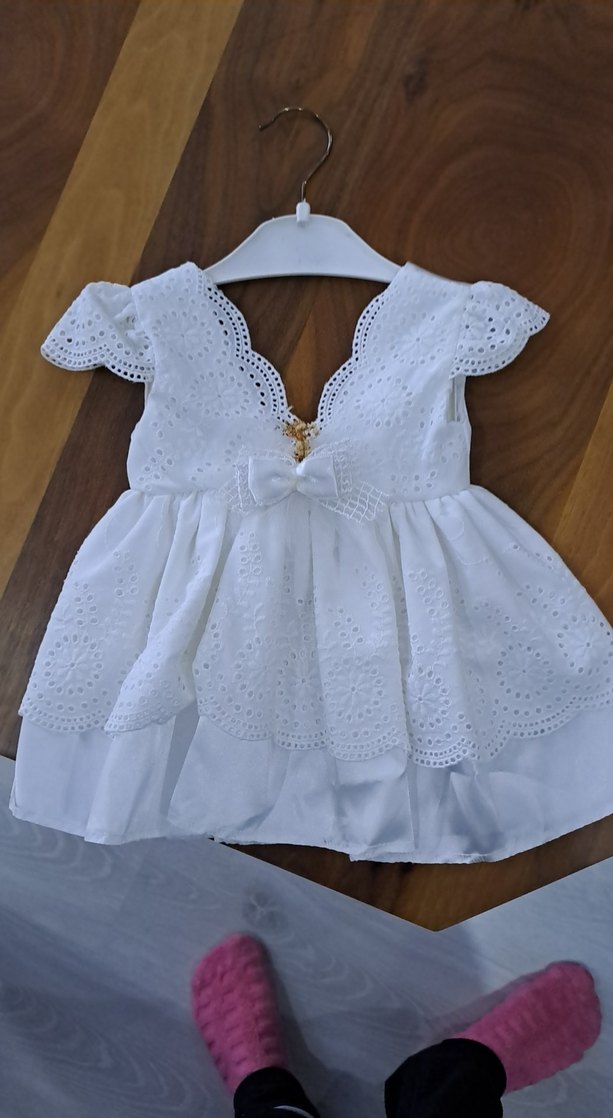 Kısa kollu, V yakalı beyaz kız çocuk elbisesi, nakışlı dantel detayları ve fiyonk süsüyle, pamuklu yumuşak kumaştan yapılmıştır. ✨