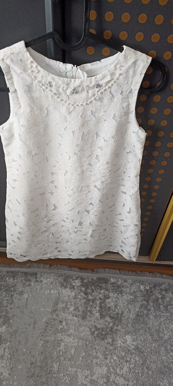 Nakışlı dantel detaylı, kolsuz beyaz bluz. hafif keten kumaştan, regular kesim, vintage ve bohem stil için uygundur. abiye gece elbisesi olarak düğün elbisesi olarak da kullanılabilir . kusuru yok temiz. vaktim olmadı ütülü fotoğraflayamadım. Kırışık durması o nedenledir (yıkama kaynaklı çekme kumaşta bozulma v.s kesinlikle yoktur)