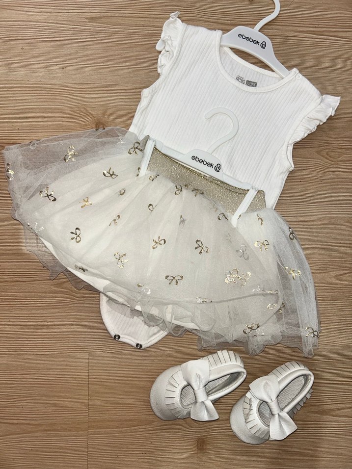 Pamuk kumaştan, kısa kollu, yuvarlak yakalı, dantelli ve nakışlı beyaz kız çocuk elbisesi.bir kez diş partisinde kullandı ayakkabılarla beraber fiyattır