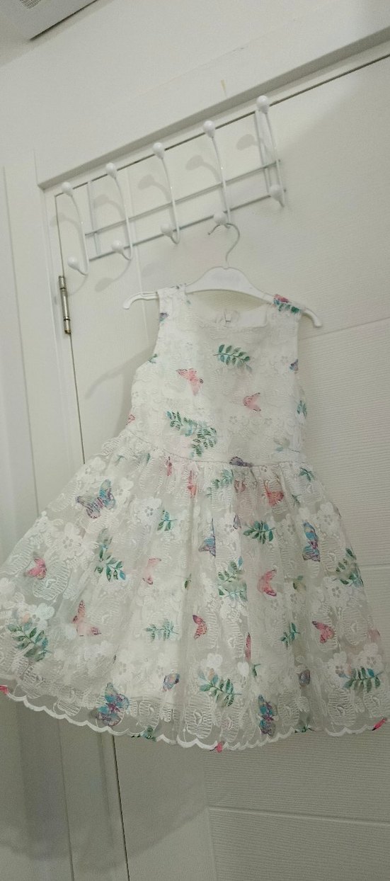 Kolsuz, beyaz dantelli, kelebek ve yaprak nakışlı elbise. V yaka ve bol kesim, bohem tarzda tasarlanmıştır.