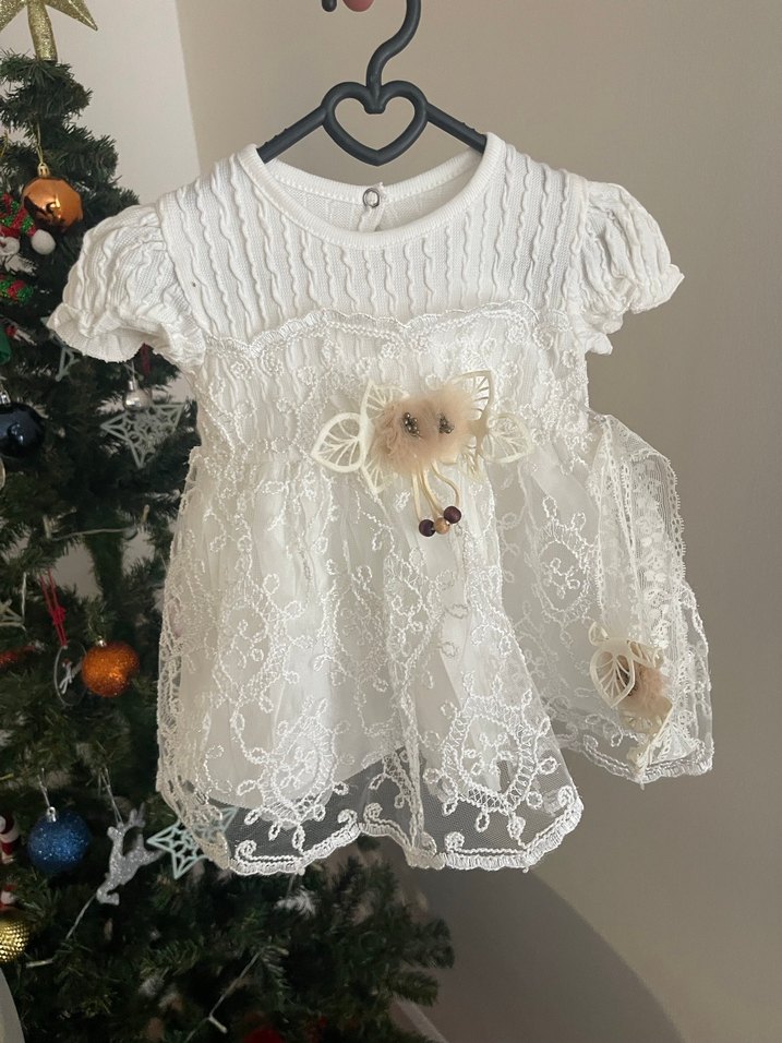 Beyaz renkli, kısa kollu, dantelli ve nakış işlemeli, ince dokulu ve bohem tarzda kız çocuk elbisesi. Bandanalı