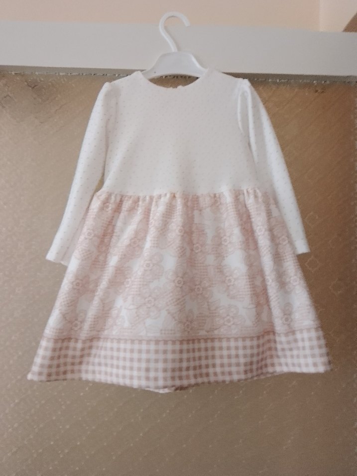 Kız çocuk elbisesi, uzun kollu ve yuvarlak yakalıdır. Pamuklu, rahat kesim üst kısmı düz beyaz, etek kısmı ise dantel ve pastel kareli desenlerle modern klasik tarzda tasarlanmıştır.