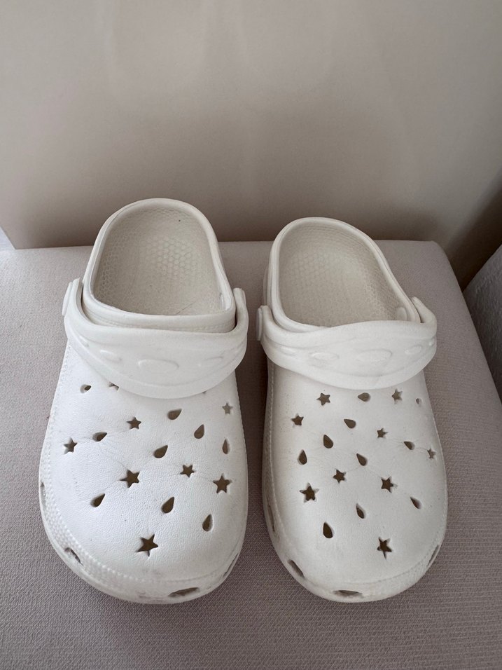Yıldız ve damla delikli beyaz kız çocuk terliği, rahat ve sade tasarımıyla günlük kullanım için uygundur.