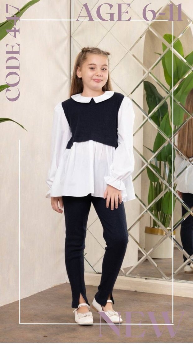Kız çocuk için uzun kollu, bisiklet yaka beyaz denim ve gri batik desenli triko detaylı bluz, rahat kesimle sunuluyor.