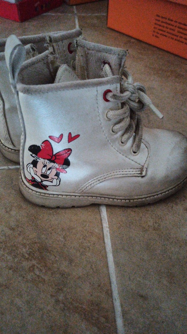 Beyaz deri kız çocuk botları, Minnie baskılı, bağcıklı ve kolay giyilen cırt cırtlı kapanışlı. Trend sokak stili için uygun. ikiside 24 numara hiç bir kusuru yok sadece tozu var