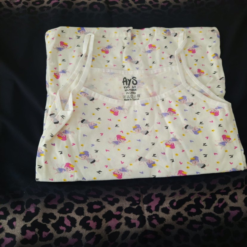 Beyaz askısız, fırfırlı ve renkli desenli, rahat kesimli kız çocuk atleti. Yumuşak sentetik kumaştan üretilmiştir, trend sokak tarzına uygundur.