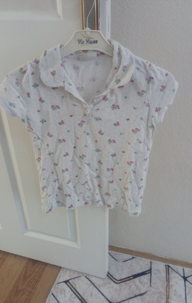 Kız çocukları için pamuklu, kısa kollu, yakalı ve düğmeli gömlek. Beyaz zemin üzerine pastel renklerde desenler bulunur. Rahat ve salaş kesimdir. önünde hafif lekeler var