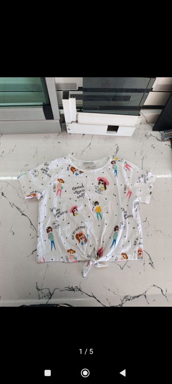 Pamuklu kumaştan, bol kesim, kısa kollu, bisiklet yaka beyaz tişört. Renkli baskılı figürler, düğmeli ve önünde bağlama detayı bulunur.