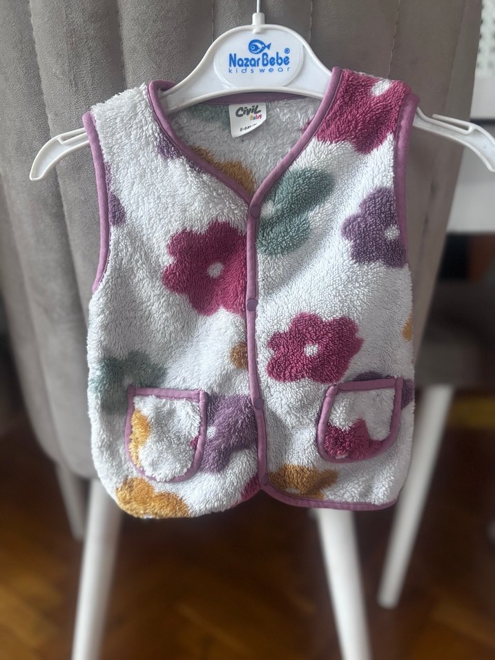 Yumuşak ve sıcak kumaştan, askısız ve kolsuz kız çocuk yeleği. Salaş kesim, bağlama desenli çiçek motifi ve küçük cepler içerir. NazorBebe markalı.