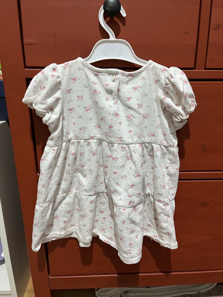 Kız çocuklar için kısa kabarık kollu, bol kesim ve V yaka pamuklu elbise. Pastel renkli çiçekli baskı ve fırfır detayları bulunur. H&M