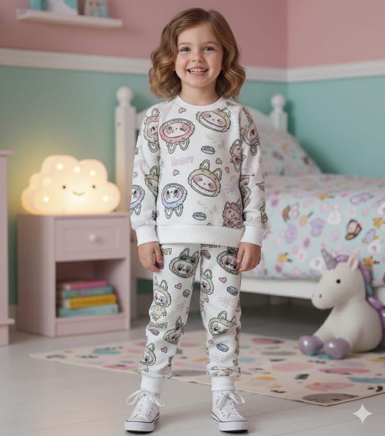 Kız Çocuk Beyaz Desenli Rahat Eşofman Takımı