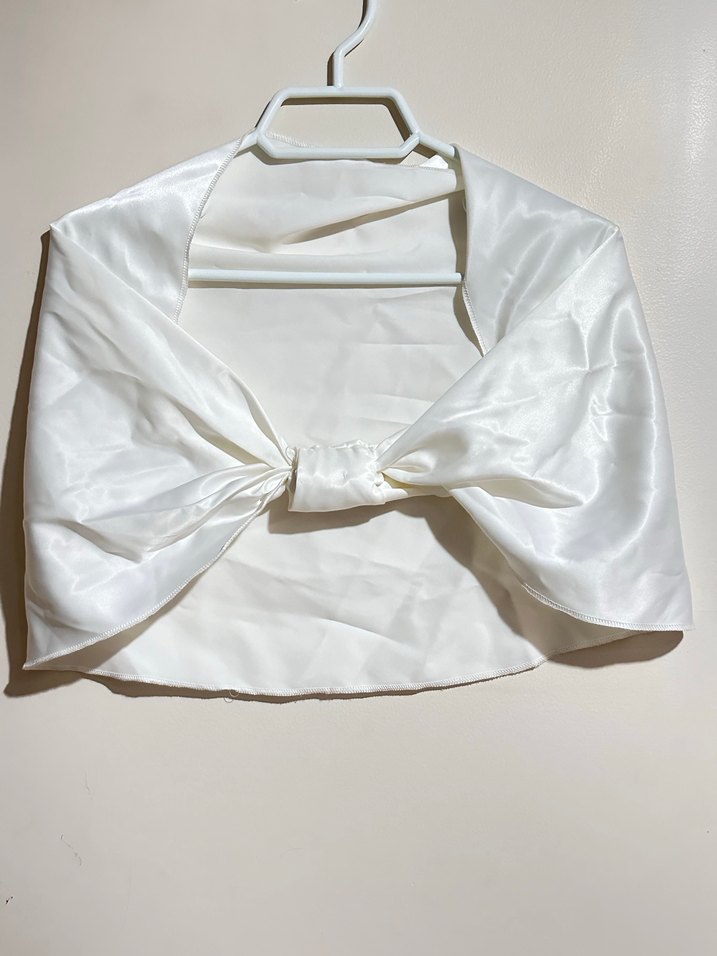 Kız çocukları için beyaz, drapeli tasarıma sahip, askısız yaka ve ince askılı kollu, sentetik kumaştan yapılmış dar kesim bolero. Bohem tarz ve klasik şıklık sunar.✨