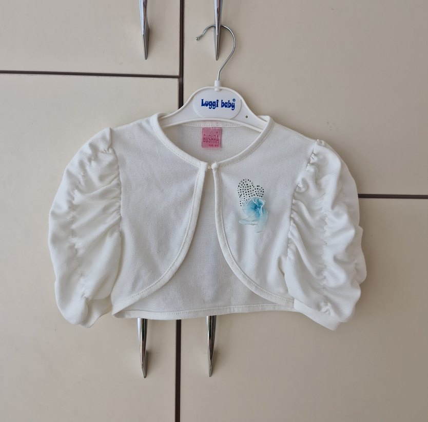 büzgülü kollu, düğmeli ve ruched detaylı beyaz kız çocuk bolero, yumuşak triko kumaştan üretilmiştir. Küçük baskı ve mavi çiçek detayı bulunur.
