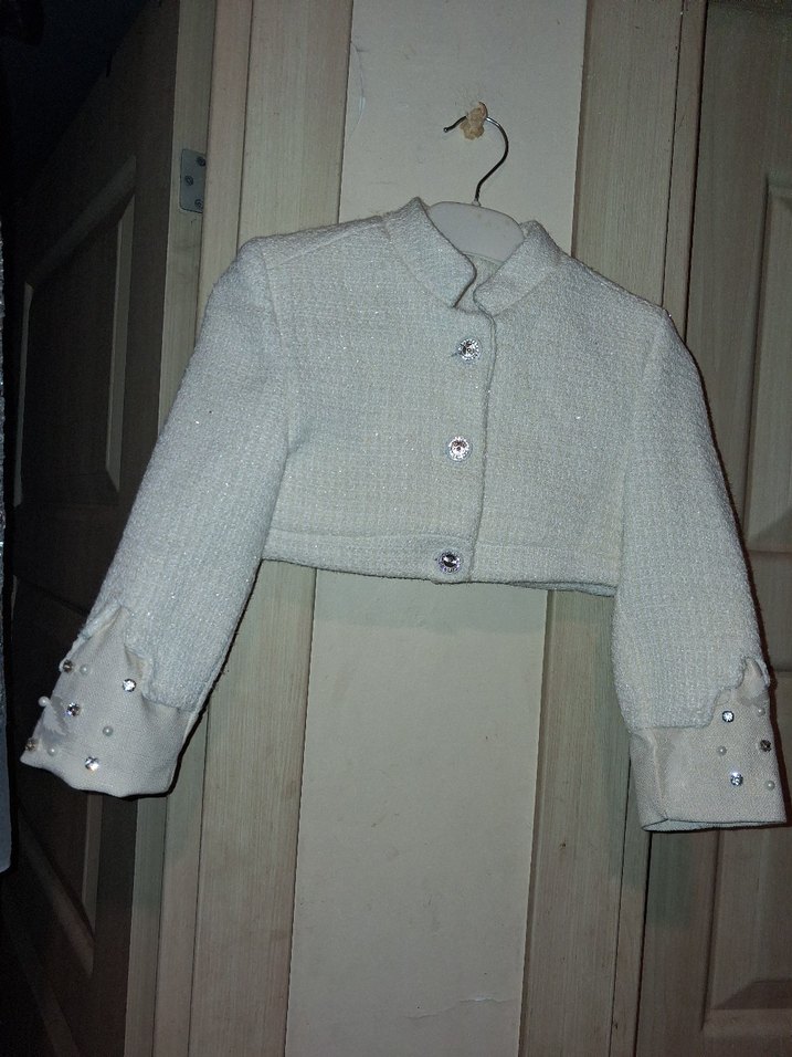 Kız çocuklar için düğmeli, yakası kesikli ve triko kumaştan yapılmış beyaz bolero. Uzun kollu ve manşetlerinde süs düğmeleri bulunur. 5 no