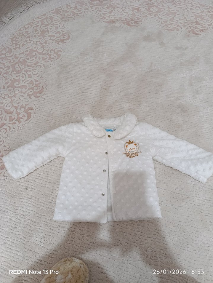 Kız çocukları için beyaz, düğmeli ceket. Notlu yaka ve nakış detayları vardır. Rahatlık için yumuşak kumaştan, bol kesimdir.