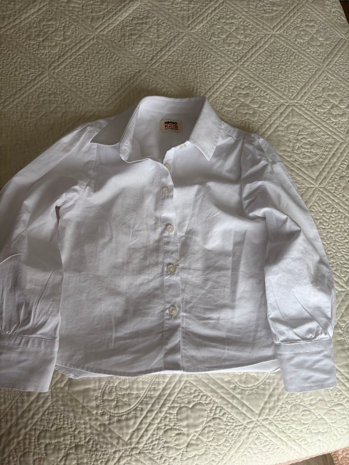 Kız Çocuk için gömlek türü kumaştan, düğmeli ve yakalı, uzun kollu beyaz gömlek. Rahat ve bol kesim, günlük giymek için uygundur. Normal boyda ve sade tasarıma sahiptir. #kızçocukbeyazgömlek #kotonkids #6yaş