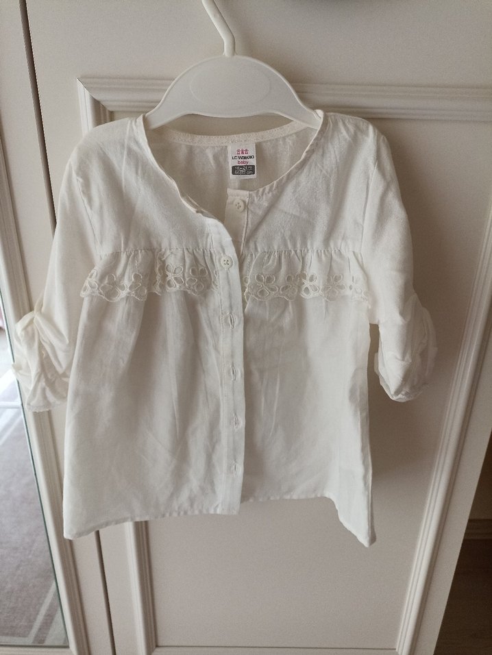 Beyaz keten kumaştan, uzun kollu, düğmeli ve yuvarlak yaka kız çocuk gömleği. Gevşek kesimli, sade ve bohem tarzda, ince dantel detaylı.