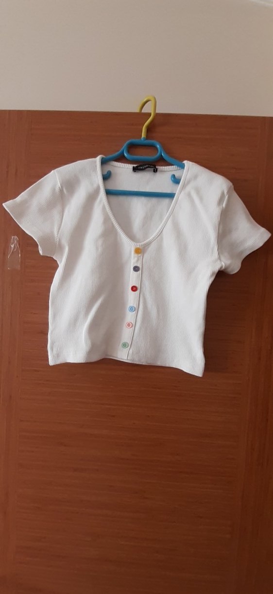Pamuk kumaştan, kısa kollu ve düğmeli, beyaz renkli, kız çocuklar için fit kesim tişört. Trend sokak stili için uygundur.
