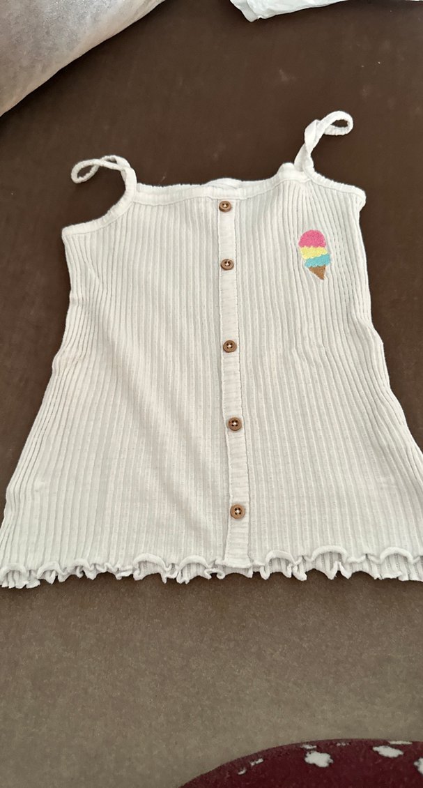 Pamuklu, askısız beyaz kız çocuk atleti, düğmeli ve nakışlıdır. Rahat kesimli, nakışlı pastel dondurma deseniyle sokak stiline uygundur.