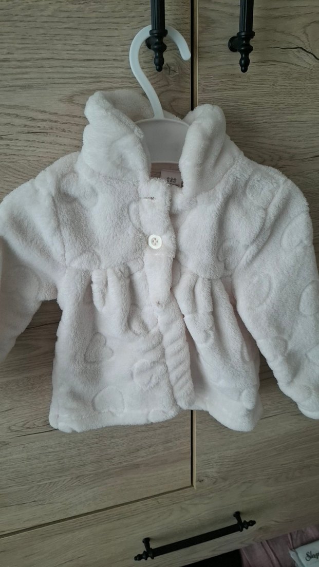 Kız çocukları için düğmeli, yakalı ve bol kesim beyaz peluş ceket. Pastel tonlarda, kalp desenli sade tasarım, sokak stili için uygundur. ❄️ Giyilmedi denecek kadar temiz