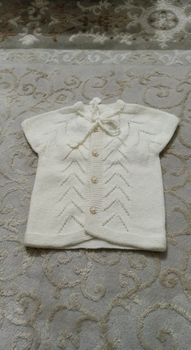 Kız çocukları için beyaz renkli, kısa kollu, bol kesim örgü düğmeli ve yakada fiyonk detaylıdır.