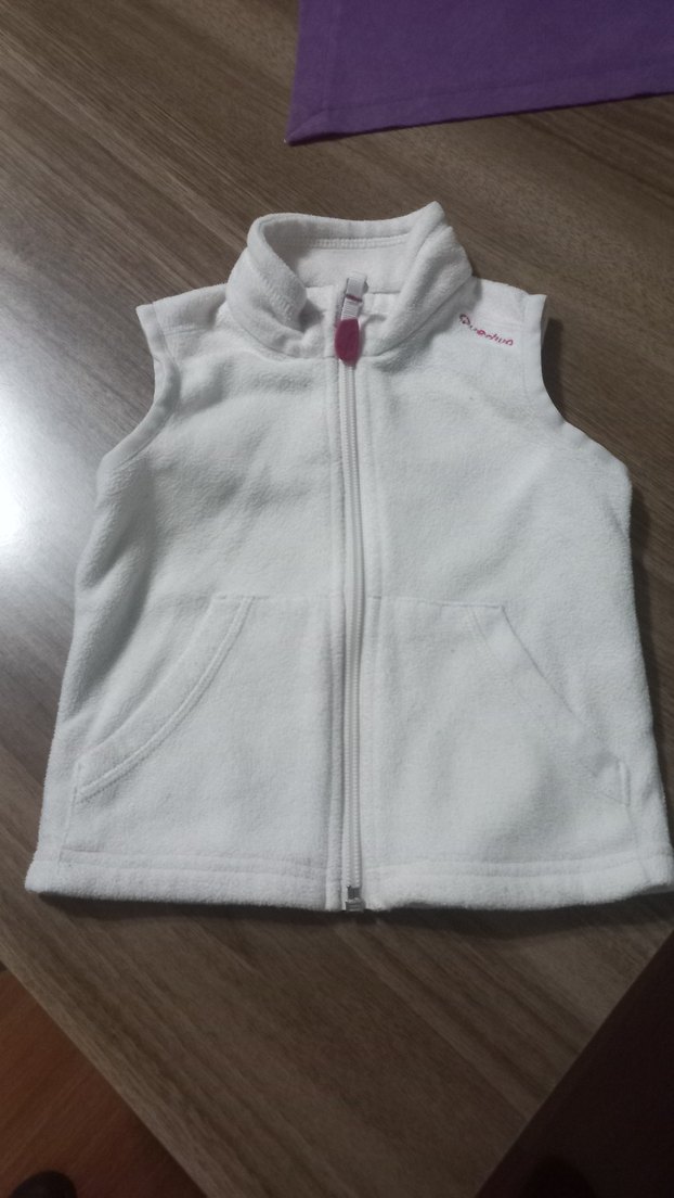 Kız çocukları için fermuarlı, bisiklet yaka ve dar kesim beyaz yelek. Yumuşak ve sıcak kumaştan, kolsuz ve sade tasarımlı, sokak stili için uygun. polarli