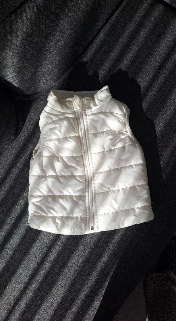 Kız çocukları için fermuarlı, yakalı ve kolsuz beyaz yelek. Yumuşak ve sıcak kumaştan, sokak stili için uygun, sade tasarım.