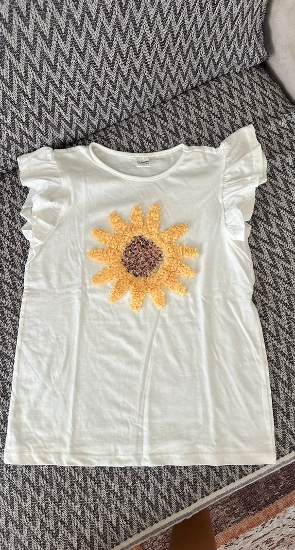 Beyaz ince örme kumaştan, kısa fırfırlı kollu, yuvarlak yakalı, ayçiçeği baskılı bol kesim kız çocuk tişörtü.
